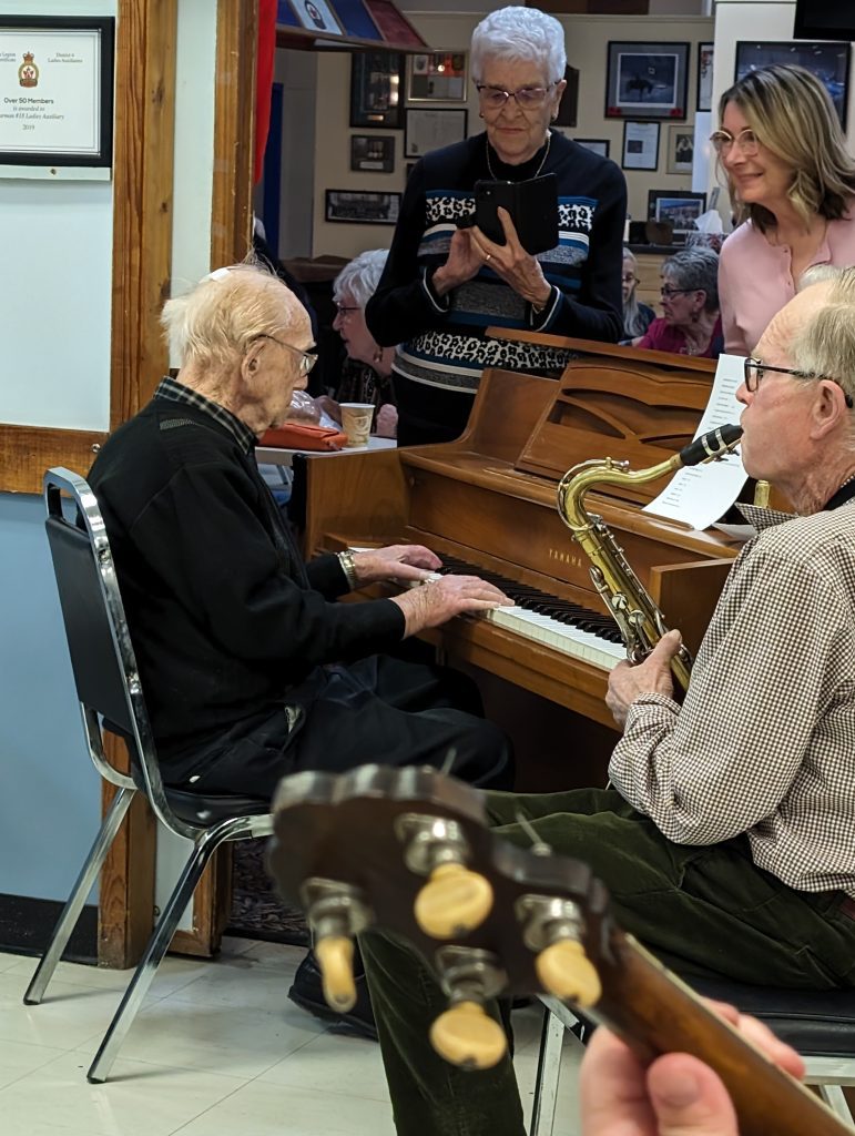 Second Vice-President Karen Maxwell presented Carm Colvin a gift commemorating his 100th birthday.