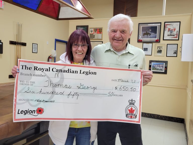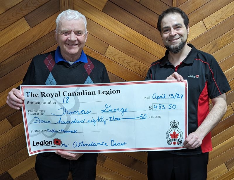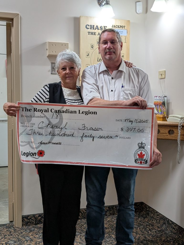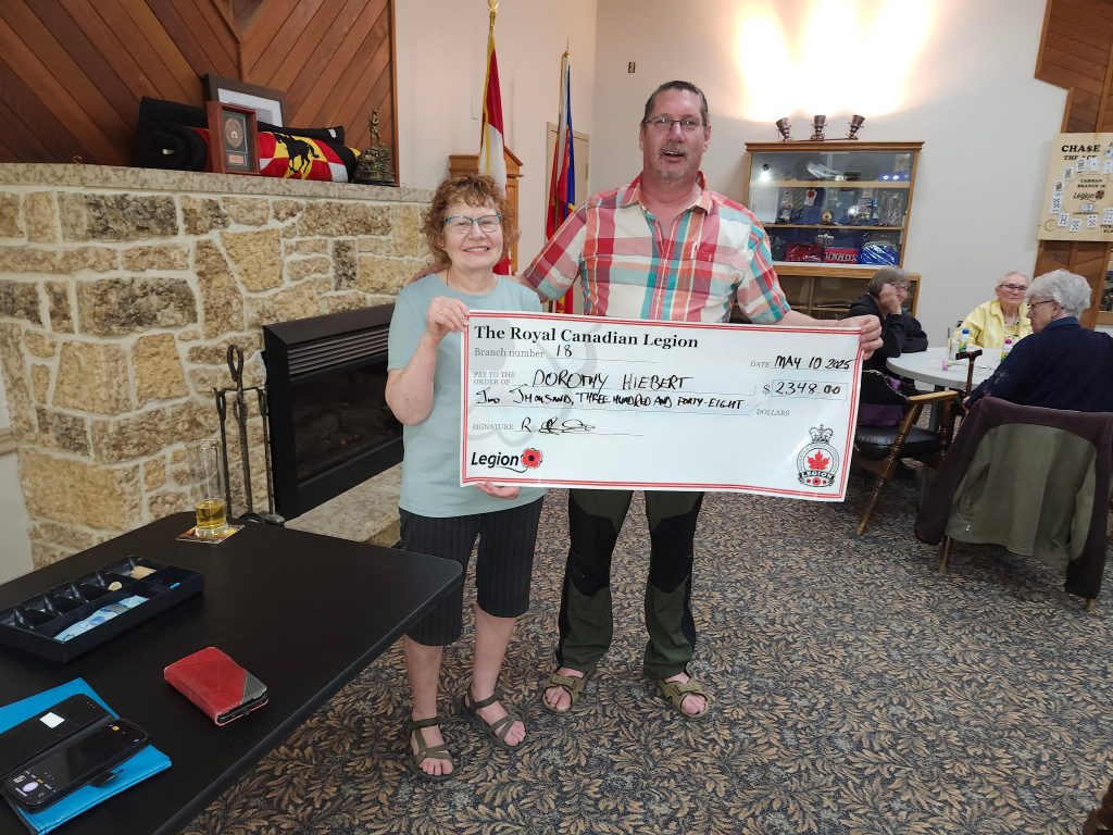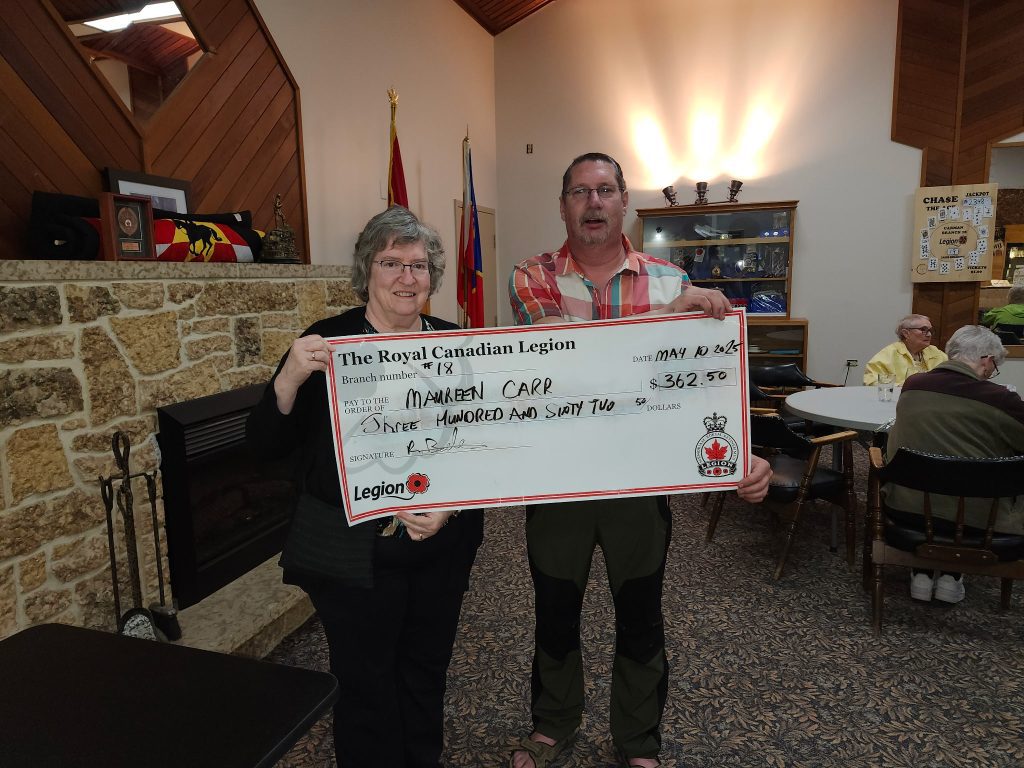 Card Draw winner Marilyn Smith being presented her cheque by Commitee Chairman Jeff Hall